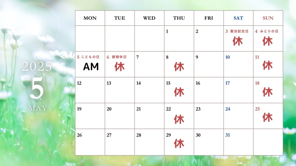 さて、5月の営業案内です。通常木曜は休診日ですが、連休になるため5/2は営業しております。