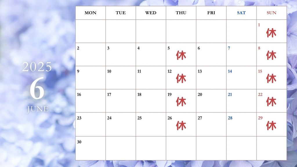 さて、6月の営業案内です。カレンダー通りで木・日のお休みになります。