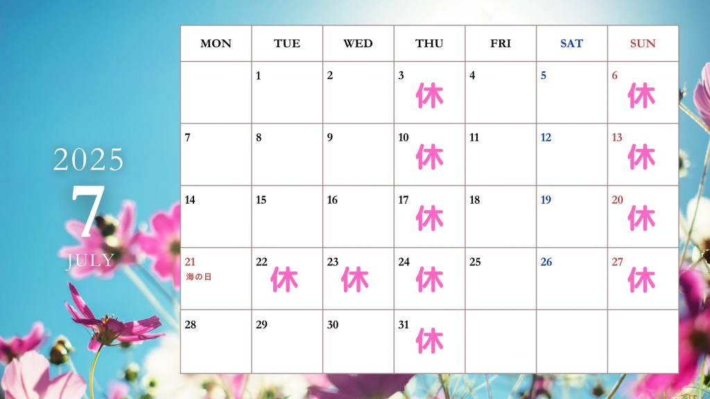 さて、7月の営業案内です。7月はイレギュラーなお休みがありますので、ご注意ください。