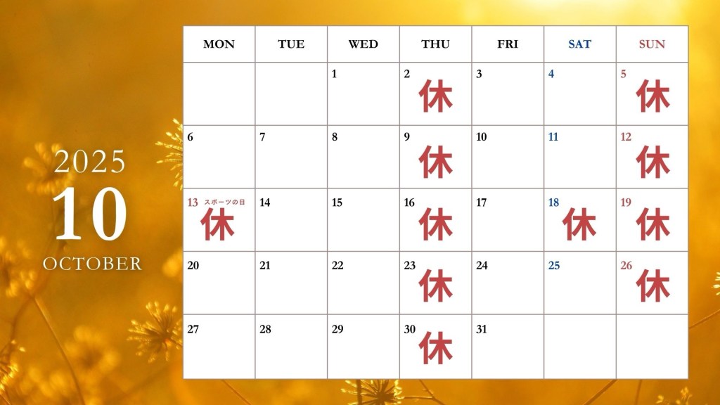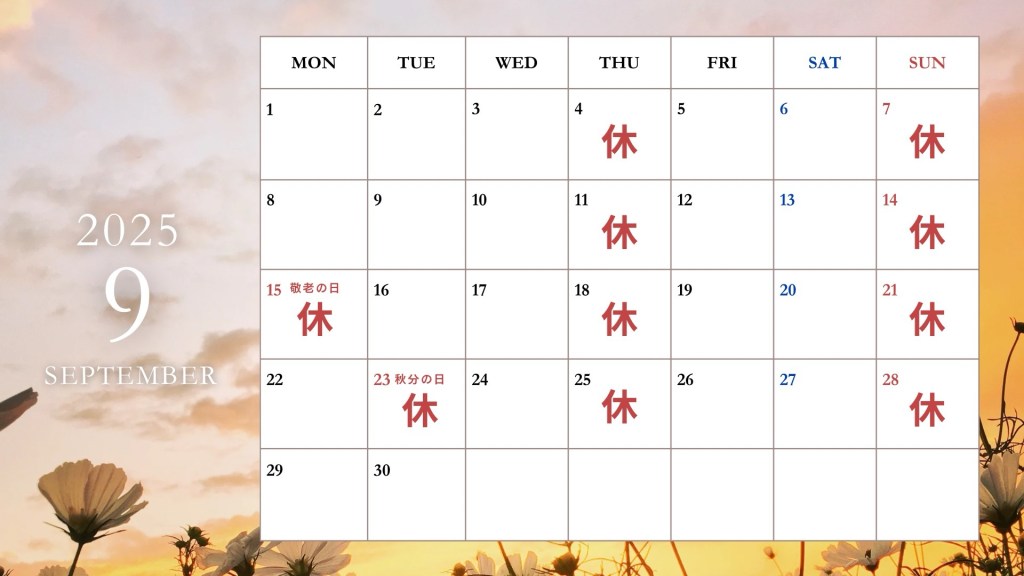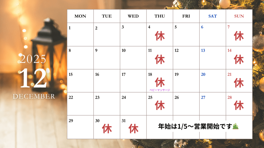 年末年始のお休みは、12/30(火)〜1/4(日)となっております。お休み中もラインでの問い合わせは受け付けておりますので、お気軽にご連絡ください。