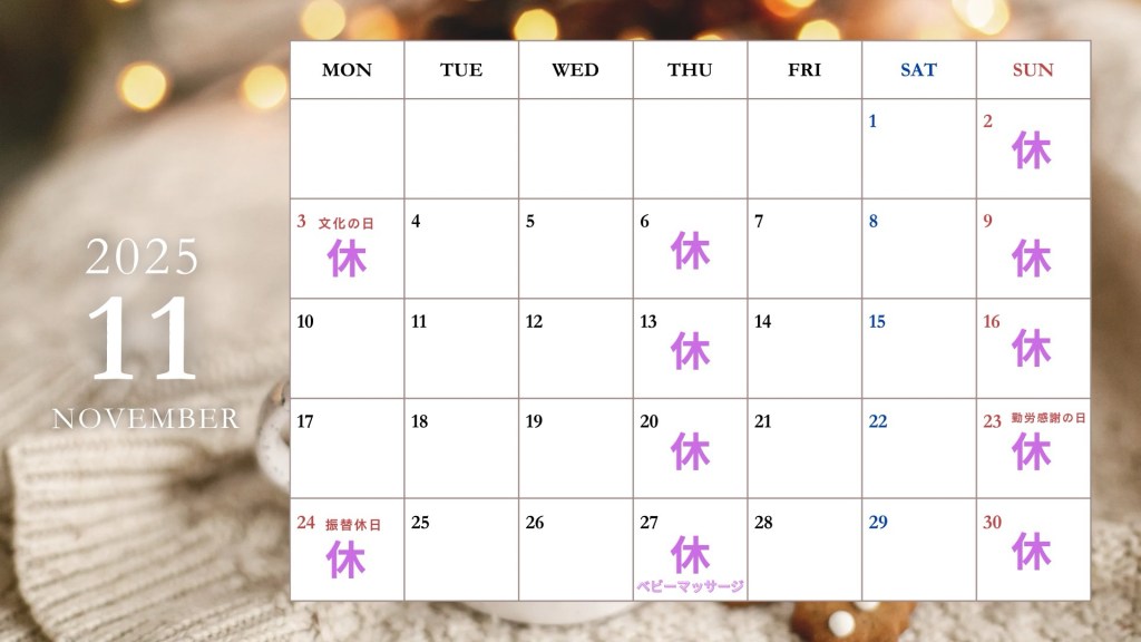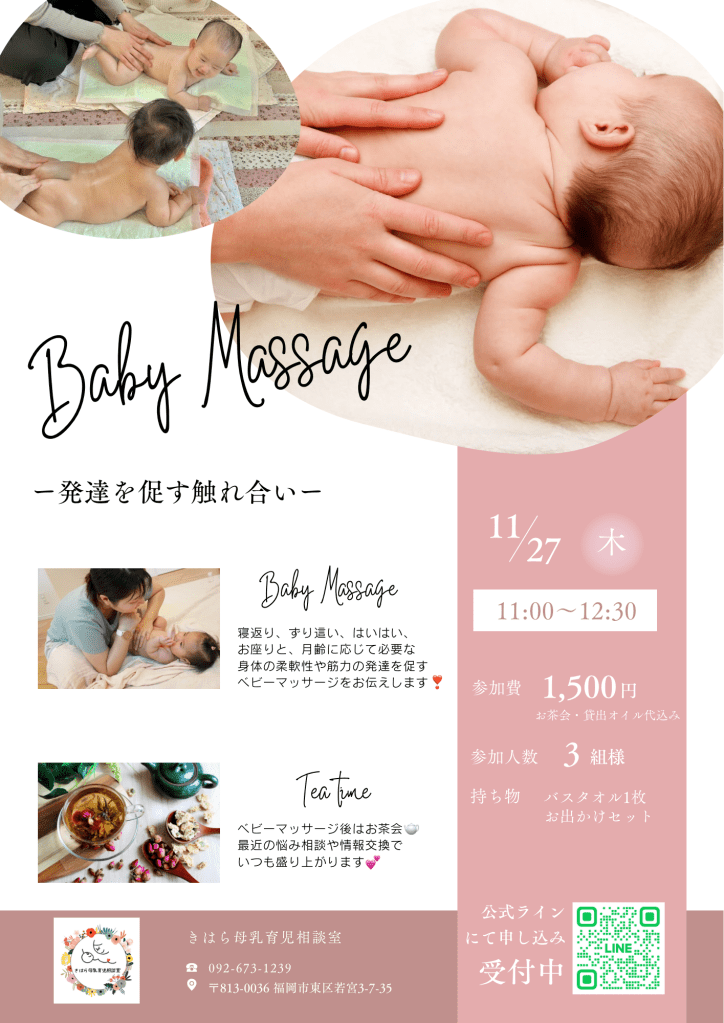 11/27(木)は、ひっそりと始めたベビーマッサージの3回目を開催します。3組限定なので、ご興味あるお母さんは公式ラインでご連絡ください🌱